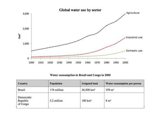 The charts below give information about the use of water supply for Australia's agricultural products in the year 2004 , and they also show the value of these statistics to the Australian economy in the same period. Overall, while fruit products were so less in percentage , 11% of water agriculture, however, in second side of agriculture side the fruit increased to 44%.