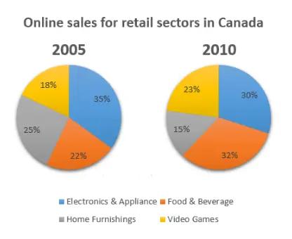 illustrates the percentage of online shopping in 2005 and 2010 for retail sectors in Canada.