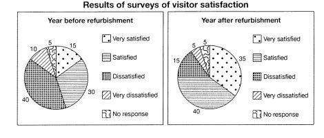 The table and the pie chart depict information about the number of people who visited the Ashdown Museum and the amount of their satisfaction before and after reconstruction.