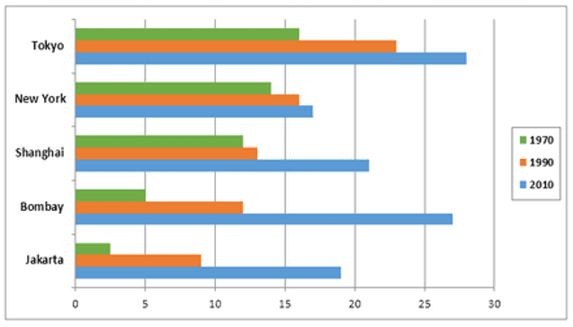 it was more for 2 and 4 million people in the other two cities. New York and Shanghai had approximately 14 and 12 million residents in 1970. In the next four decades, Tokyo’s people almost doubled and it retained the top position. New York was the second largest city but it became the least populated city in 2010. Surprisingly in 2010 population growth in Bombay and Jakarta outranked and exceeded all other cities.Linking Words