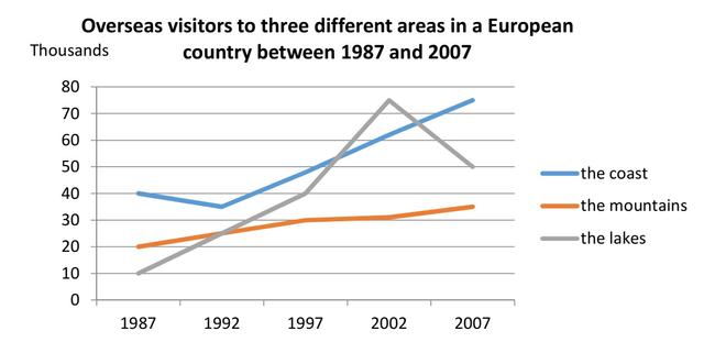 The line graph illustrates the different areas in the European country visited by a number of international tourists between 1987 and 2007.
