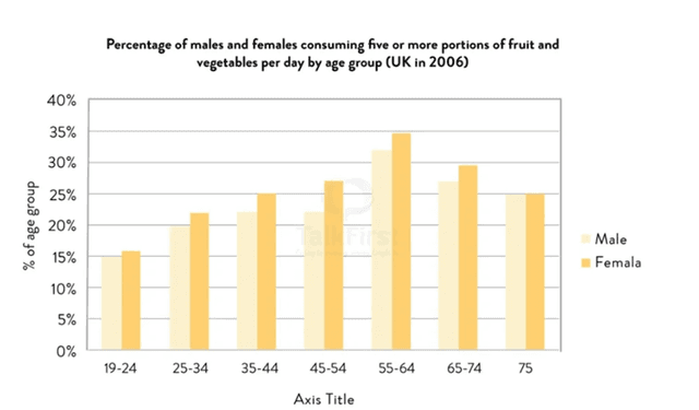The bar chart illustrates the proportion of men and women consuming more than five portions of fruits and