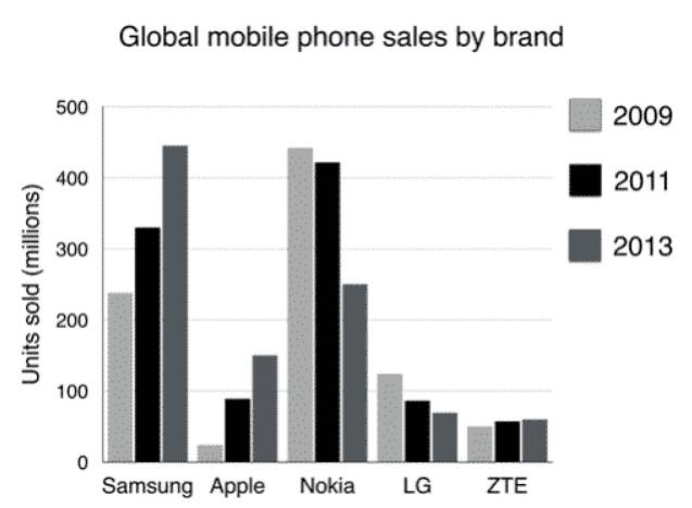 by the top five mobile phone manufacturers sold globally in the years 2009, 2011, and 2013.