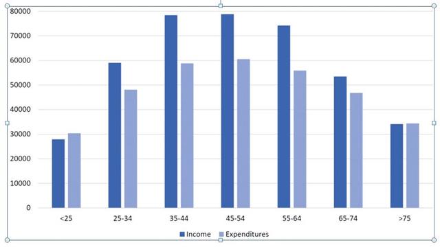 , the elderly who were older than 75 years old had roughly equal revenues and expenditures which was around 35000 Linking Words