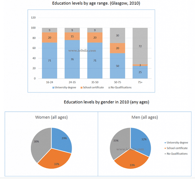 The bar chart and pie charts compare data about education levels by gender and age range in Glasgow
