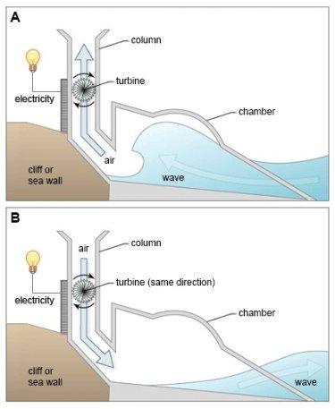 The artificial construction is based on a cliff or a sea wall. It consists of a chamber, in which the wave gets in and in a long column, where a turbine is located.