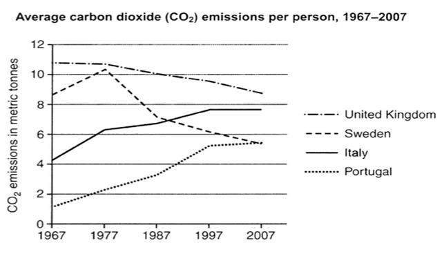 The line graph demonstrates variations in the average quantity of CO2 released by individuals in four nations, namely the United Kingdom,