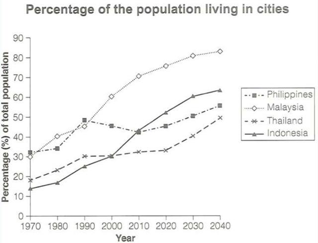 in four Asian countries from 1970 to 2020, with predictions for 2030 and 2040.