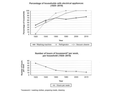 The first line graph illustrates the proportion of households using electrical appliances and the second line graph presents the number of hours spent by one household on chores per week in one country from 1920 to 2019.