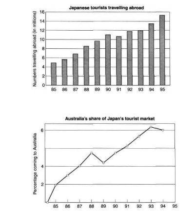 The bar chart illustrates the number of Japanese travellers in millions who are going out of Japan and the line figure presents the proportion of Japanese sightseers who choose