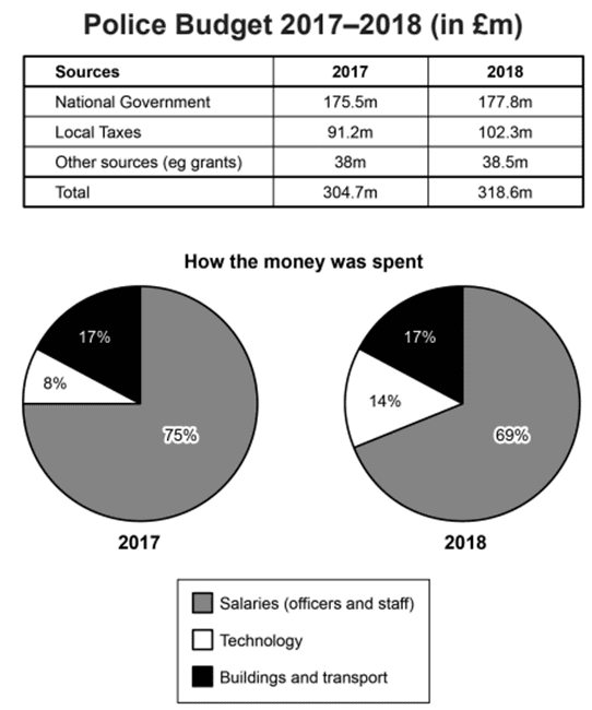 The table illustrates the amount of the police budget sourced from four categories in a certain British area in 2017 and 2018,