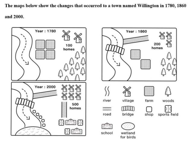The maps illustrate changes made to the town of Willington between 1780 and 2000 years