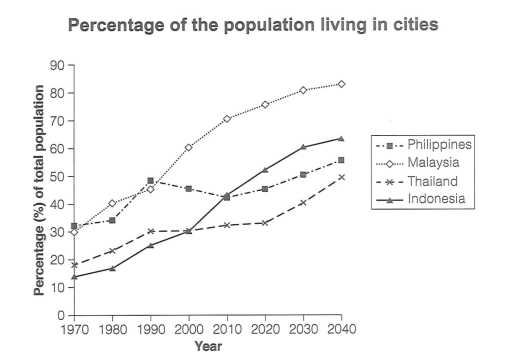 The given line graph shows the data about the rate of the well-known in four Asian countries living in cities, where