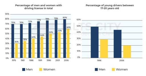of males and females who applied for driving licenses at the age of 17-20 were described in another bar chart.