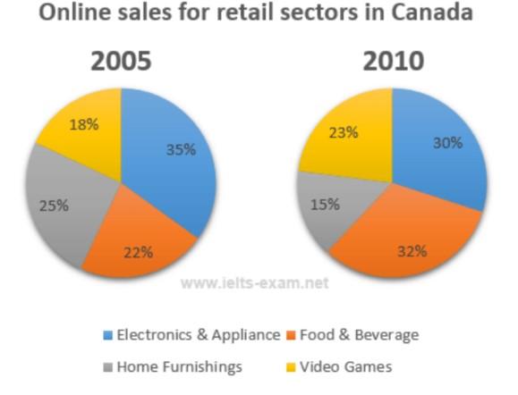 The presented pie chart gives data on online vending for retail sections in Canada in 2005 and 2010