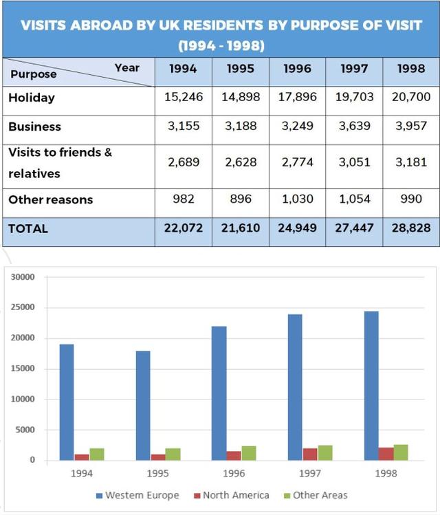 and visit purpose from 1994 until 1998. Based on the data provided, in the given time span, travelling for pleasure has increased Use synonyms