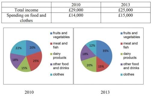 The presented table and pie charts compare data about how much money people earn and their spending on the 5 various sections in the UK at 2 points in time namely, 2010 and 2013.