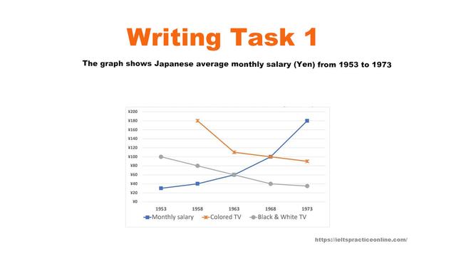 The given line graph illustrates the workers' income every month and the cost of 2 different types of TV in Japanese currencies in the period of 1953 to 1973.